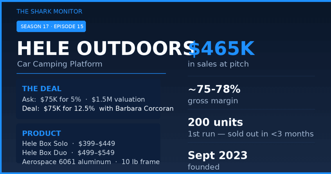 He used his severance to launch Hele Outdoors instead. That was September 2023. By March 2026, he was standing in front of five investors on national television with nearly half a million dollars in sales and a deal to chase.